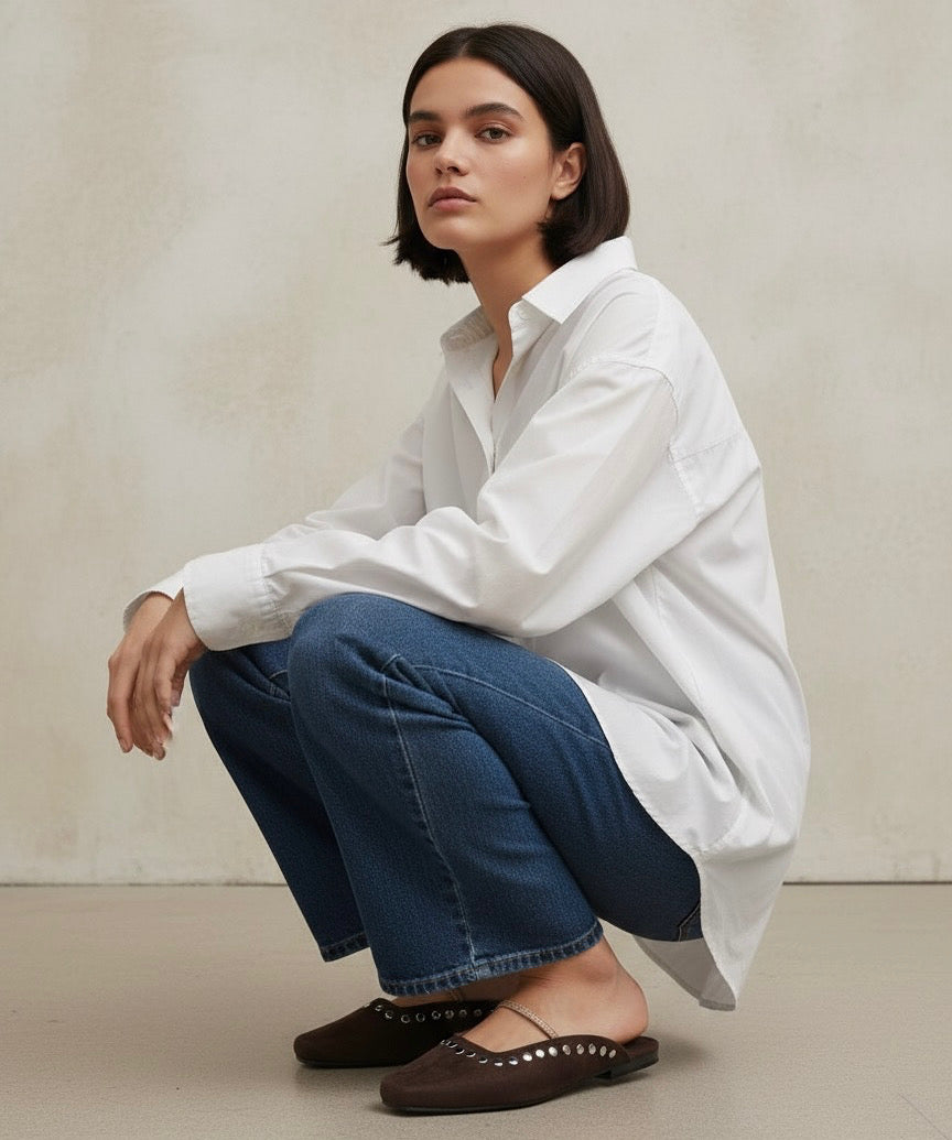 Introducing The Victoria: a stylish and quirky mule with suede flats, adorned with studs and stretchable straps. Its comfortable foam soft soles make for a delightful walking experience. Meet the Victoria and add a touch of playfulness to your outfit.