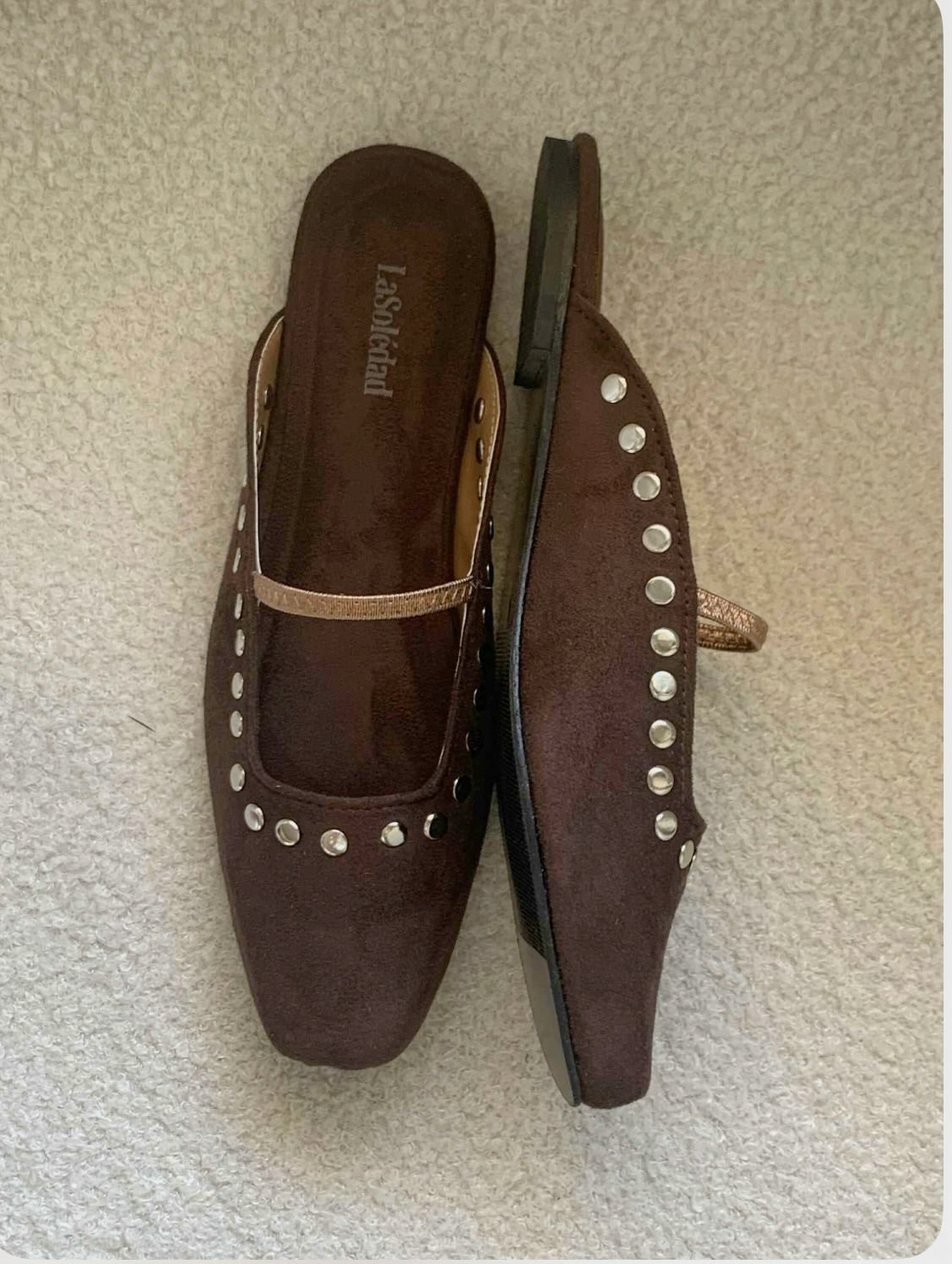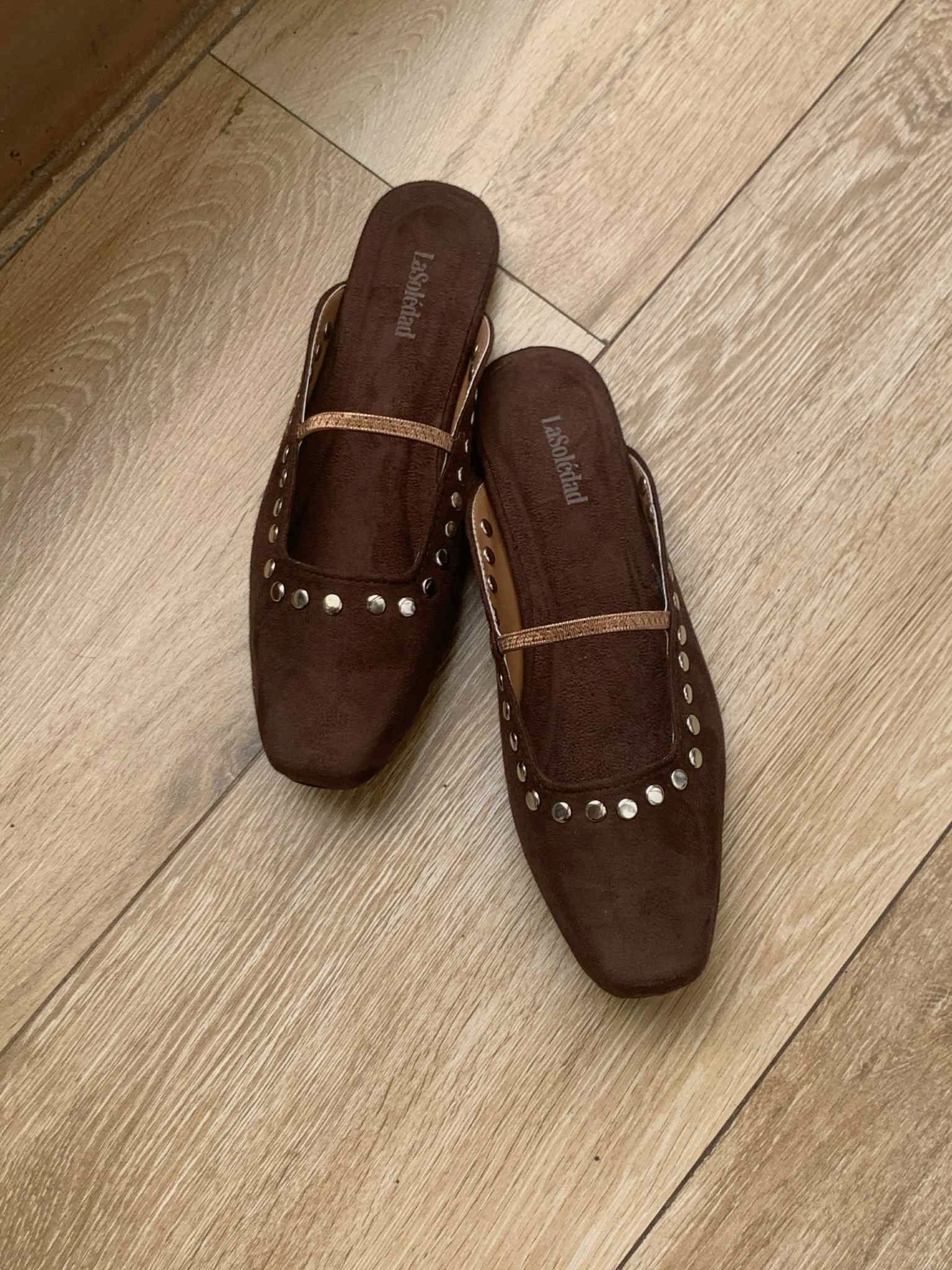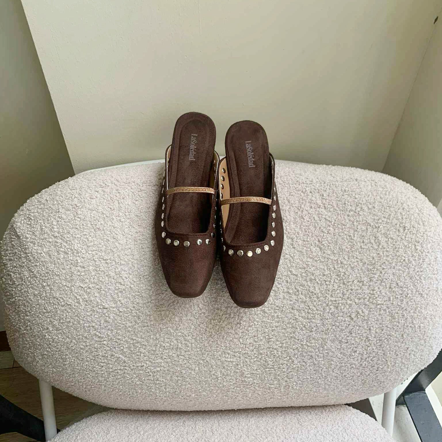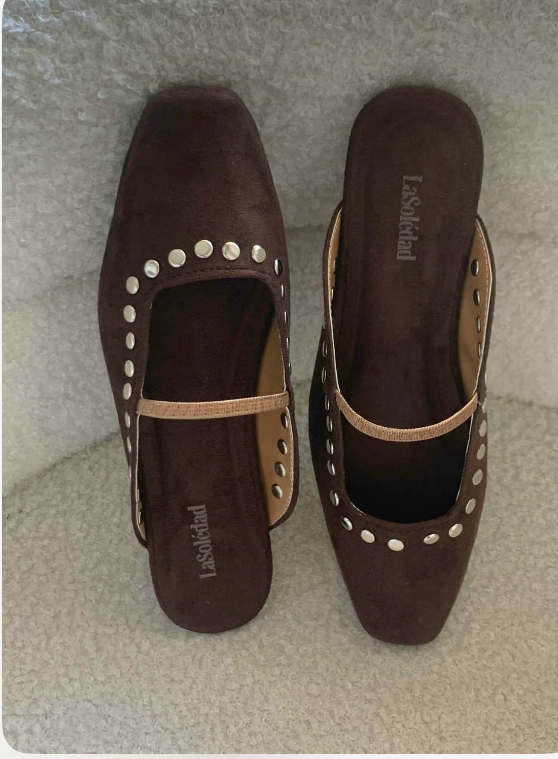 Introducing The Victoria: a stylish and quirky mule with suede flats, adorned with studs and stretchable straps. Its comfortable foam soft soles make for a delightful walking experience. Meet the Victoria and add a touch of playfulness to your outfit.